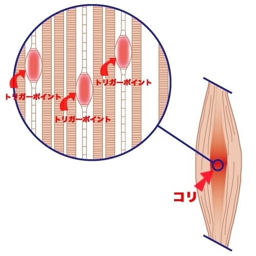 筋肉に力を入れるときに筋繊維に収縮が起こるのですが、筋繊維において実際に収縮が起こるのは、「サルコメア」という組織です。筋繊維の最小単位で顕微鏡でようやく観察できる部位なのですが、このサルコメアが過剰な刺激を受けてしまうと収縮状態から戻れなくなります。これがトリガーポイントの正体なのです。
