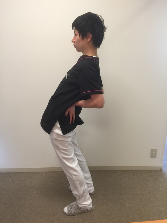 ②腰に手を当て腰をそらす。このときに、顎をあげて頭を後ろに倒さないこと。
