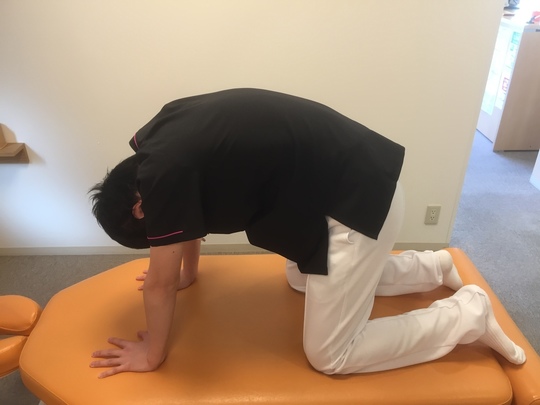 ①ネコのように四つんばいになり、両手、両足を肩幅ほどに開きます。