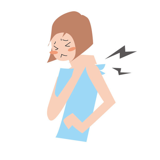 右肩が常に上がっている姿勢で、力を抜きたくても抜けない状態。手を挙げる動作が上がりきらず、肩から上に上げると痛みを伴う。