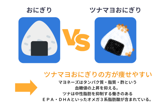 カロリー的には勿論「塩おにぎり」の方が少ないですが、「ツナマヨおにぎり」の方が太らないんです!