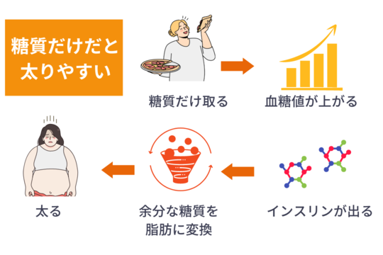 つまり「おにぎりだけ」「菓子パンだけ」という糖質だけの食事は、とても太りやすい