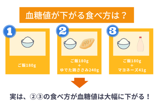糖質量は減らしていないにも関わらず、タンパク質や脂質との「合わせ食べ」をするだけで