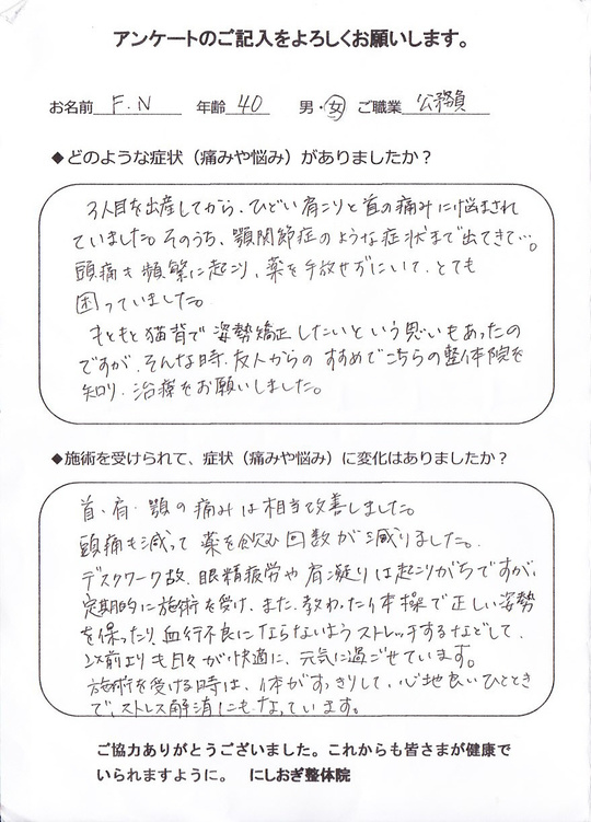 最初は激痛でかなりお辛そうでしたね。お仕事の負担が積み重なりすぎたことが頭痛と肩の痛みの原因でした。