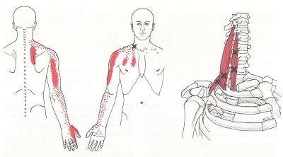 肩の付け根から外側、背中の上部、後頭部にかけて広範囲にこりや痛みが出る。
