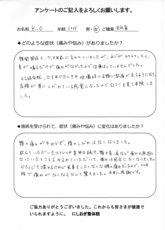 先生の施術を受け、ストレートネックの悩みが改善しました!