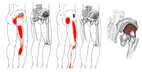 マラソン等で筋肉を酷使しすぎるとトリガーポイントが出来、赤い部分に痛みを放散させます。