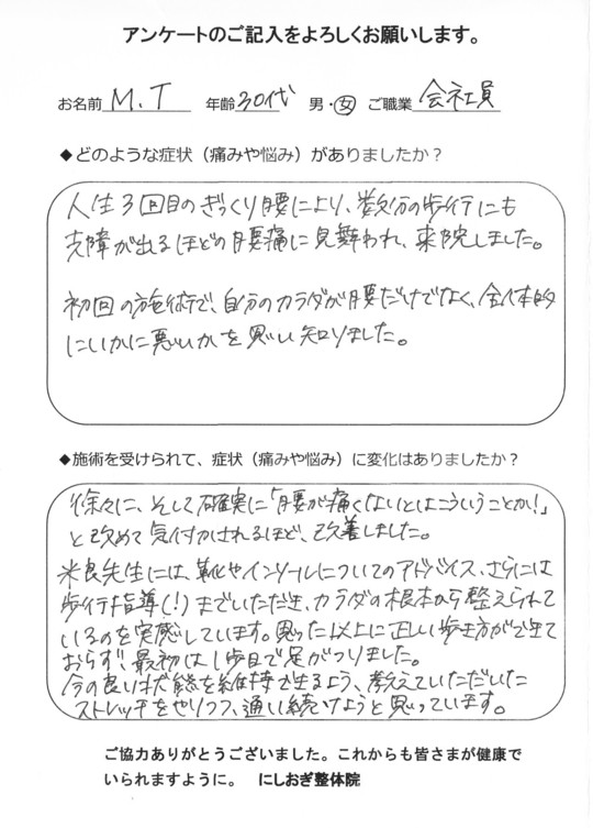 また、ぎっくり腰は再発すると言われていますが、それは正しく施術していないのと、生活習慣を見直していないからです。