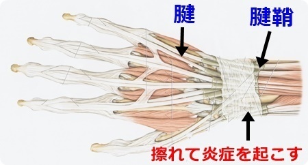 手首には骨の出っ張りがあり、引っ張られることで腱が骨の出っ張りに擦れ、炎症が起こります。
