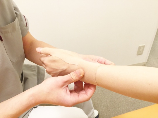 テーピングによって手首の腱鞘炎、ばね指の痛みを緩和させます。
